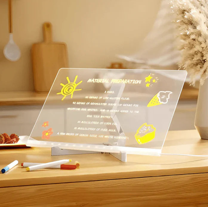 【Led Note Board with Colors】 LED Note Board with Colors is made of high-quality acrylic material, strong and durable. Acrylic Dry Erase Board is powered by USB. When connected to the power supply, it will emit a even light, ensuring that your information and design will shine in any environment.
