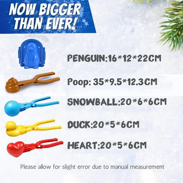 The kit includes a snow duckling maker, a penguin snowman, heart pack as well as a perfect snowball mold. Please note that the colors will be random.